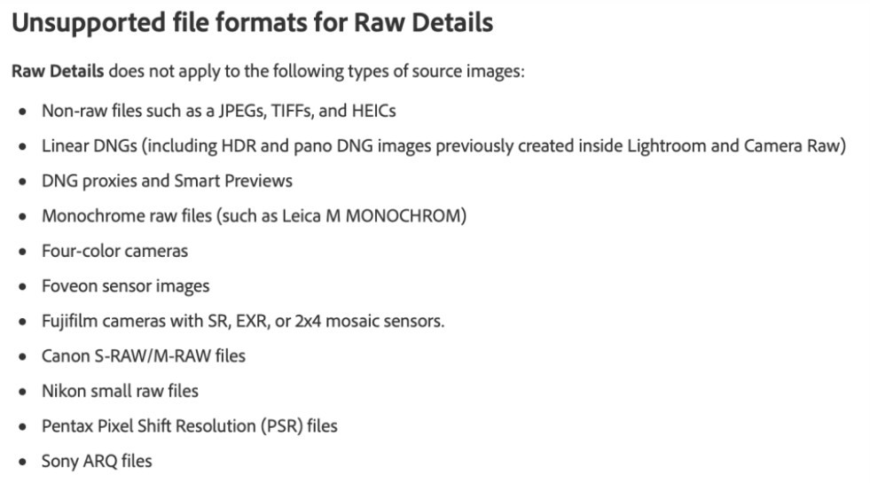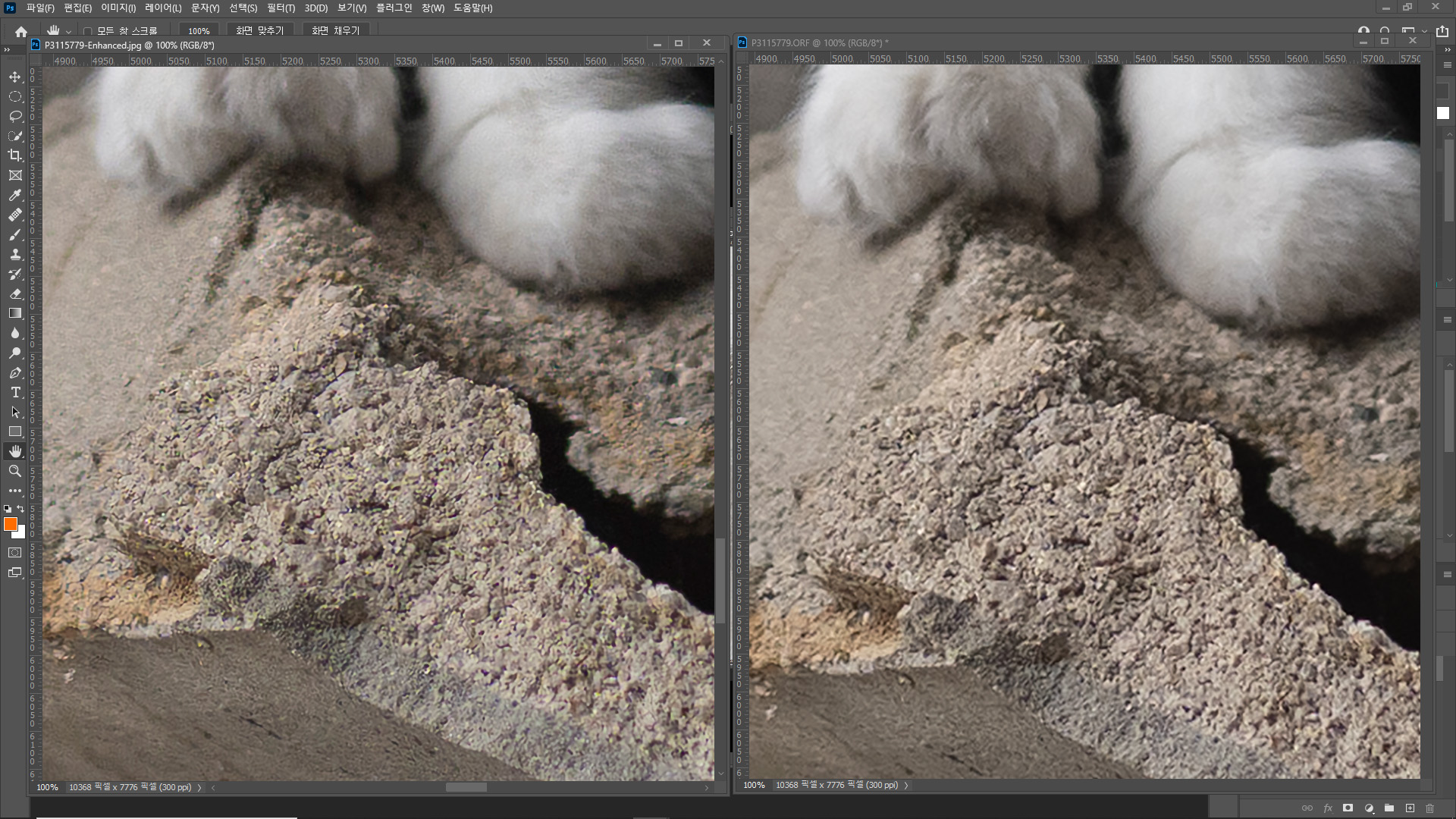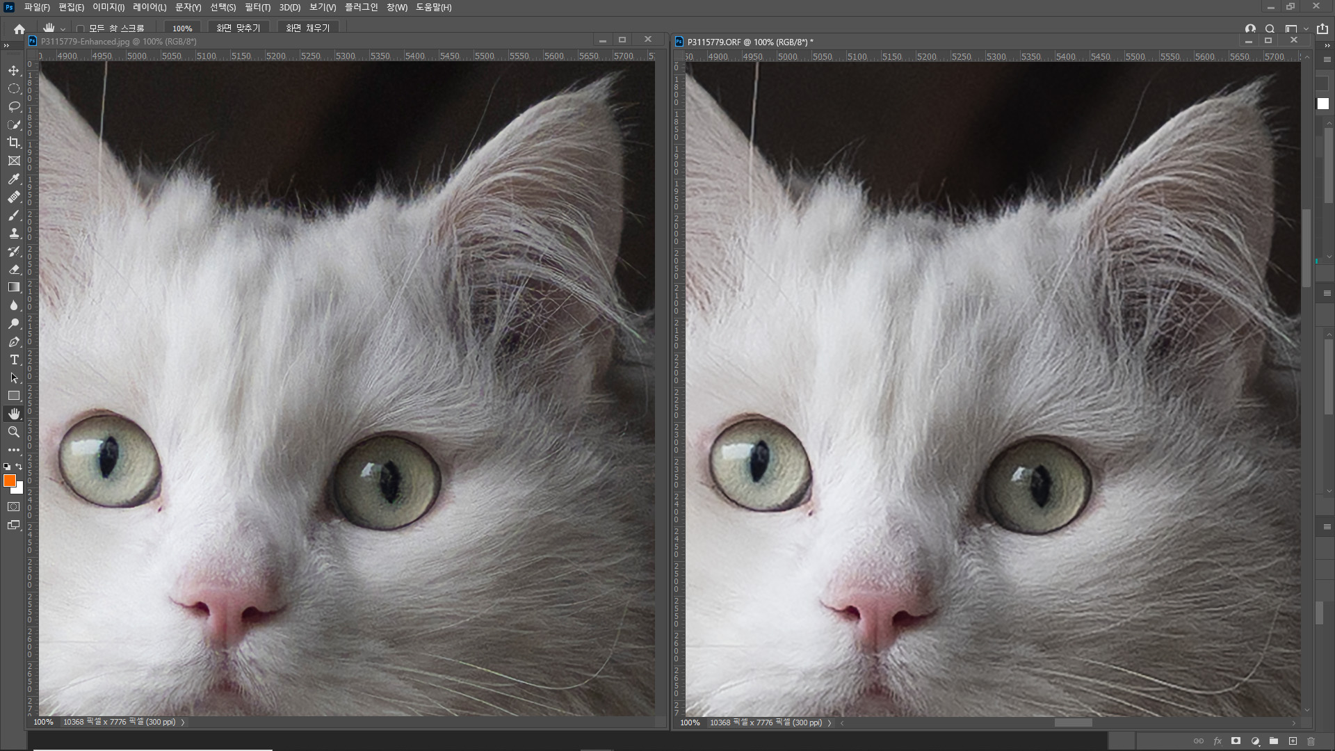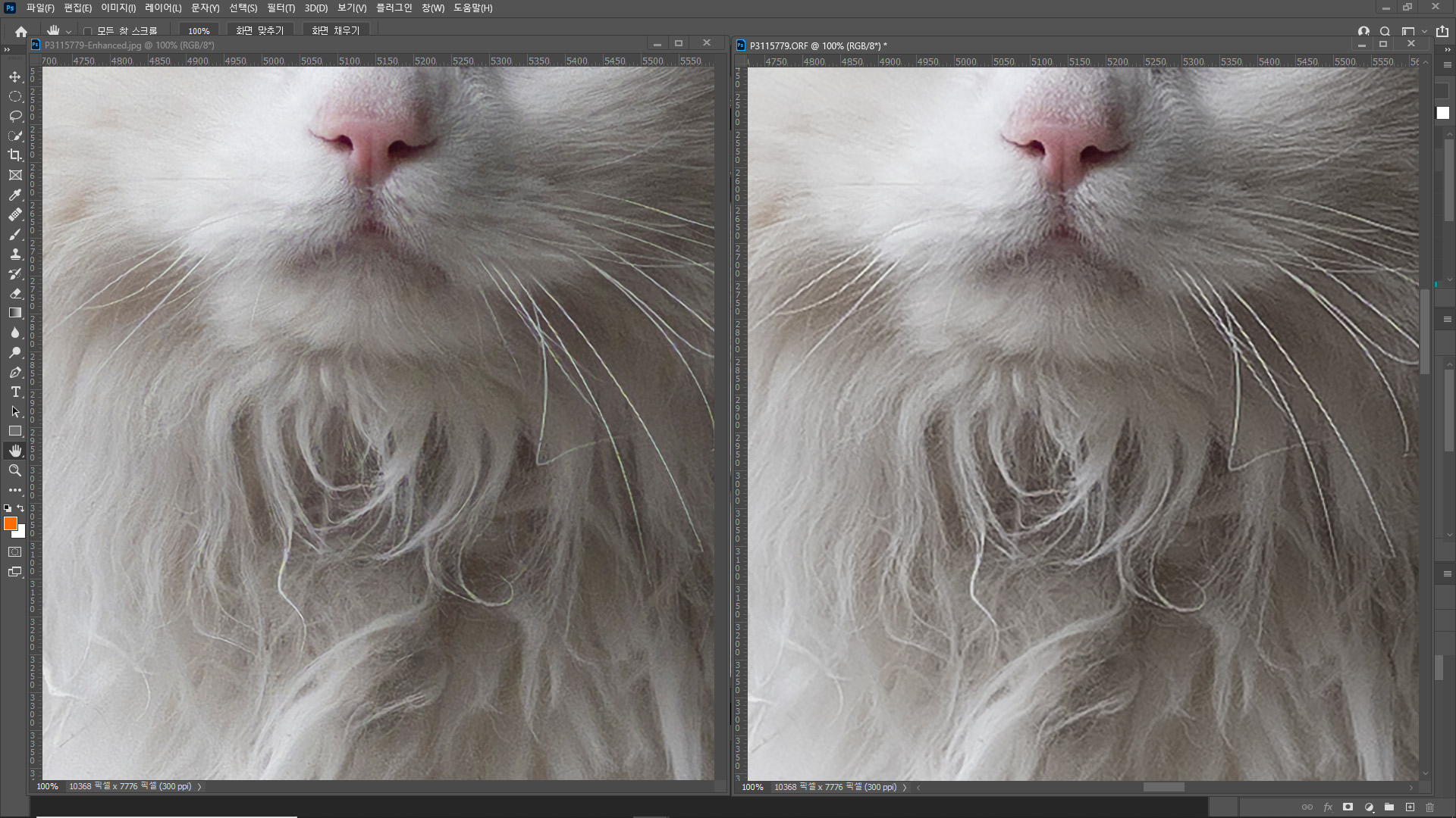 보시다시피 Enhance 기능을 적용한 이미지가 자연스럽고 디테일이 섬세하게 확대되었습니다.Enhance 적용하지 않고 포토샵에서 확대한 이미지는 거칠고 디테일이 섬세하지 못합니다.이미지를 확대할 일이 있는 분들은 이 기능을 활용하면 좋을 것 같습니다.다만 이 기능에 어떤 부작용이 있는지는 아직 확실히 파악된게 없습니다만 마지막 비교 이미지를 보면 고양이 발 밑의 초점 영역에서 약간 벗어난 부분에서 Enhance된 좌측 이미지의 경우 청록색 계열의 잡색점이 여기저기 보입니다.참고로 Camera Raw에서 Enhance되어 새로 생성된 DNG 파일은 라이트룸으로 불러오기가 되지 않네요.현재 Enhance 확대 기능은 제한이 있는데 긴 축이 65,000px을 넘거나 총 500MP을 넘는 파일이나 이미지는 지원되지 않습니다.
